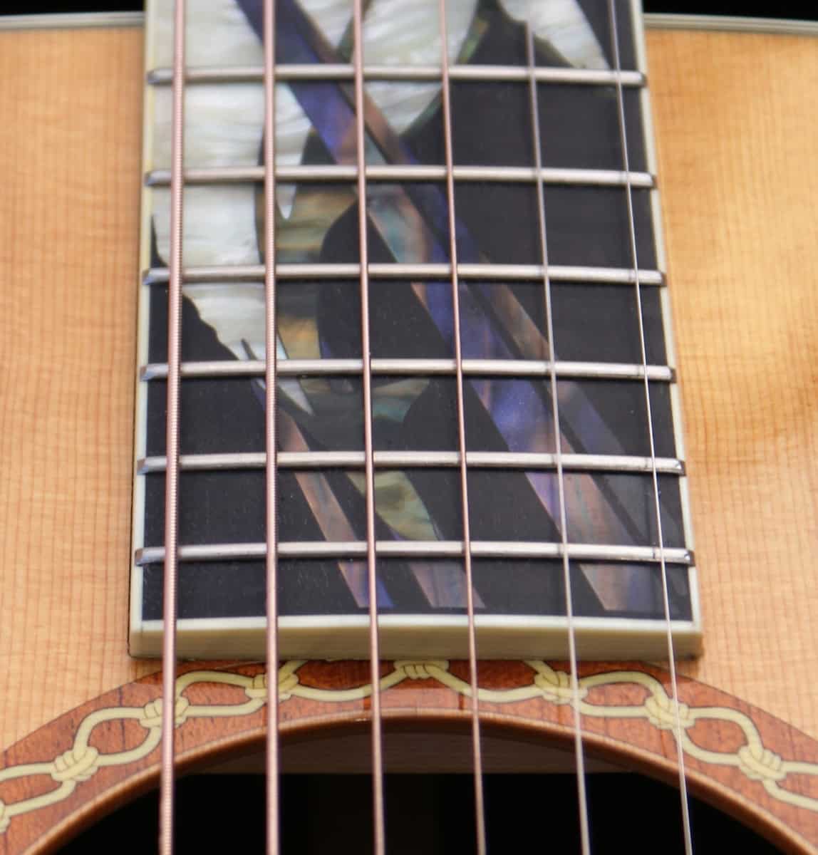 The ‘Living Jewels’ series guitars launched Taylor’s Gallery series in the winter of 1999. The concept for the GSST came about by accident, when a staffer in Taylor’s design shop happened to wear a sea turtle pendant to work one day. The staffer commented that a similar design would make a cool inlay. Pete Davies, Jr., who designed the koi fish inlay, overheard the comment, and promptly began working on a sea turtle and then Whales designs. A few hours later, everyone agreed that they were inspired pieces of work.